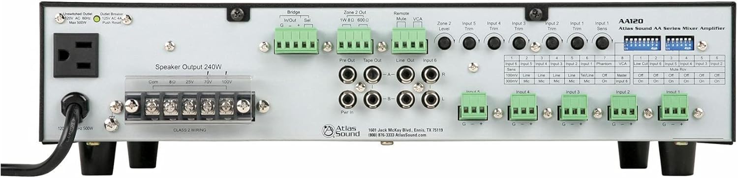 The rear panel of the Atlas Sound AA120 provides all necessary connections for power, inputs, and speaker outputs. Familiarize yourself with these connections before installation.