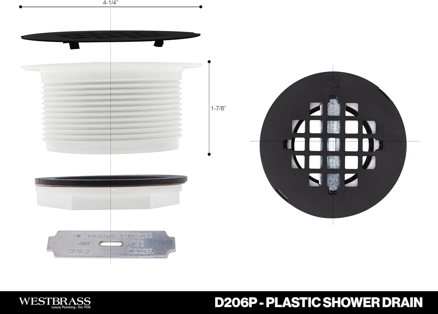 The Westbrass D206P-62 shower drain is designed for efficient water drainage in pre-formed shower stall floors. Its robust plastic construction ensures durability, while the no-caulk compression gasket system simplifies installation and provides a reliable seal. The 4-1/4 inch round grid cover in matte black offers a clean and modern aesthetic.