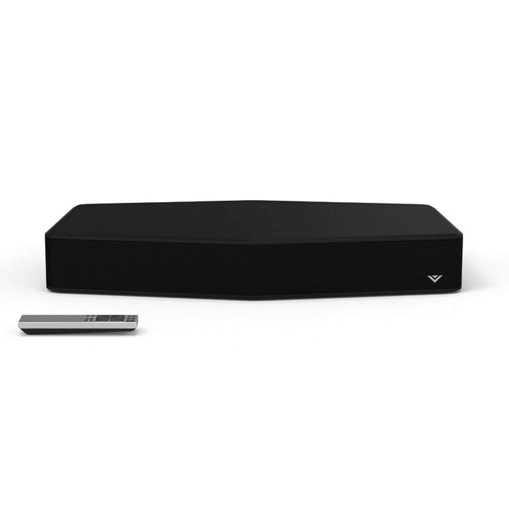 Figure 3.1: VIZIO S2120w-E0 2.0 Sound Stand with its remote control. The sound stand is black with a subtle VIZIO logo on the front right, and the remote is silver and black.