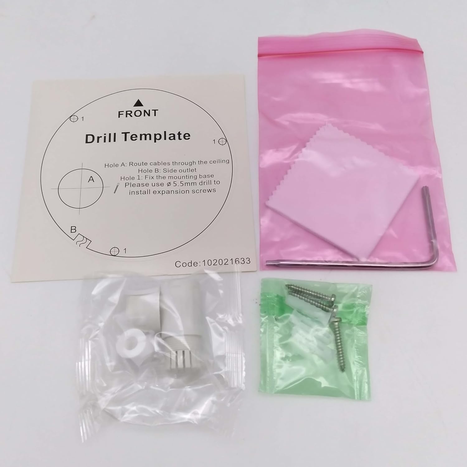 Sary: Contents of the camera package. This includes a drill template, mounting hardware (screws and wall plugs), a hex wrench for adjustments, and a waterproof connector kit for network cables. These components are essential for proper installation.