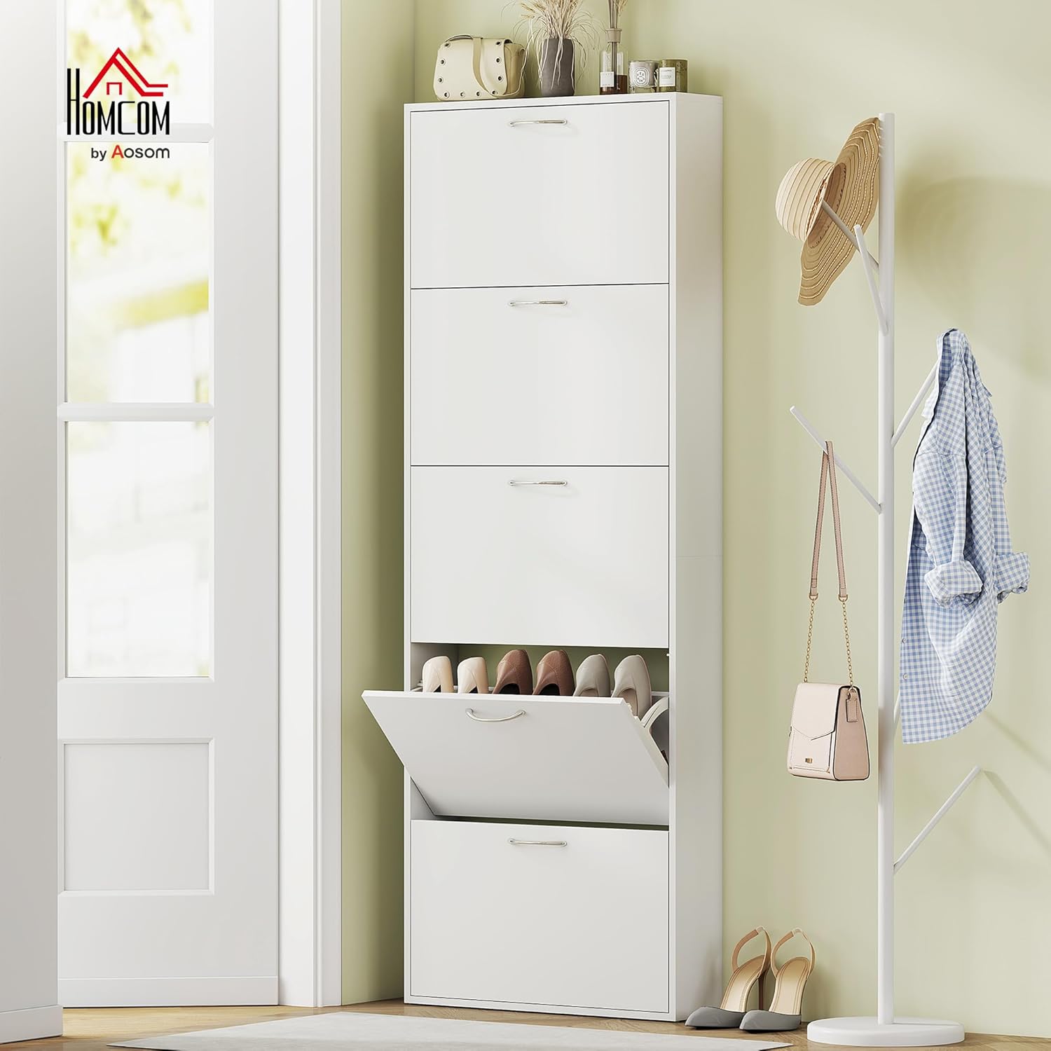 Image: The HOMCOM Slim 5-Door Tilt Shoe Cabinet, white, shown in an entryway setting with an open door revealing shoes.