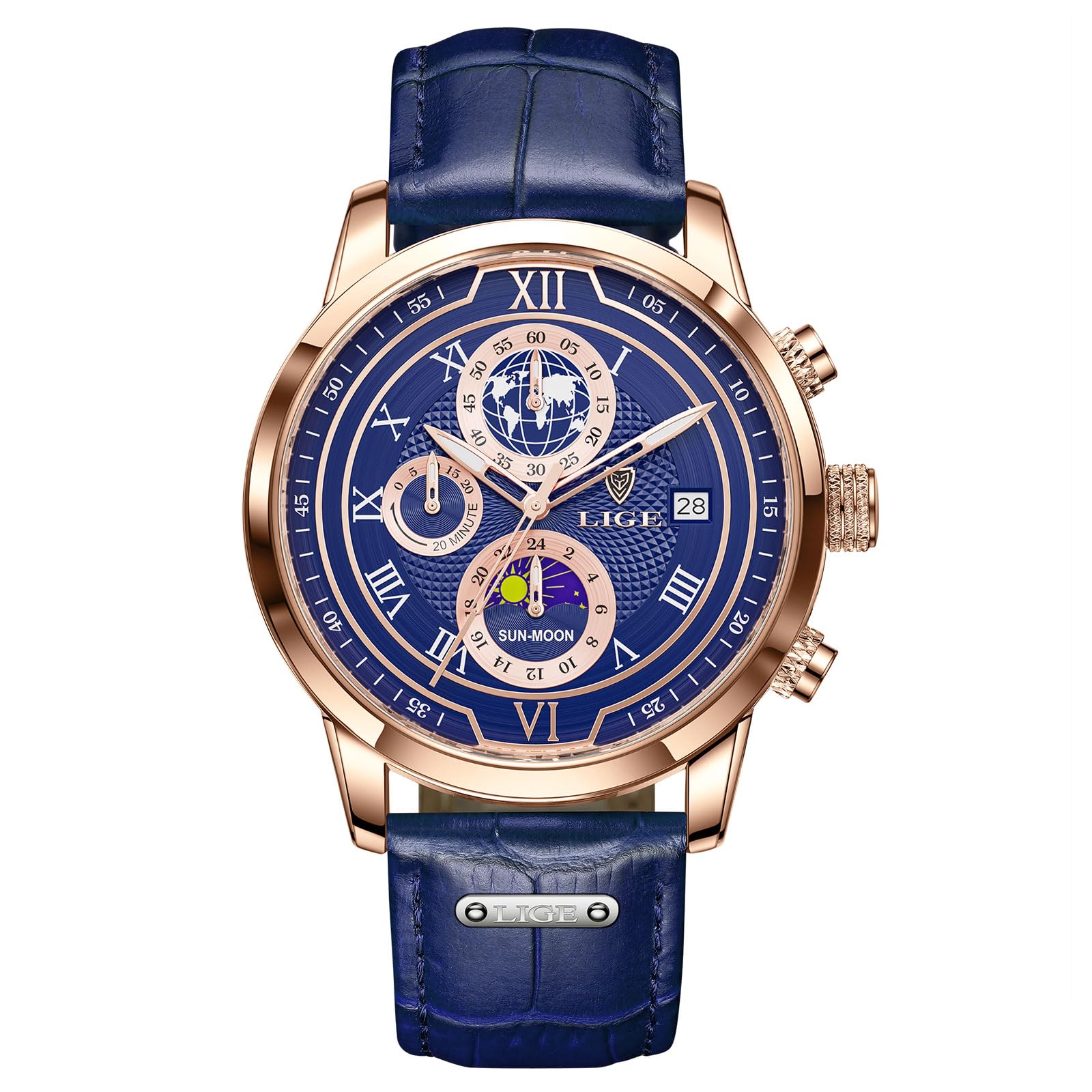 Image 1: LIGE Analog Watch Model LG8974, showcasing its blue dial, gold casing, and leather strap.
